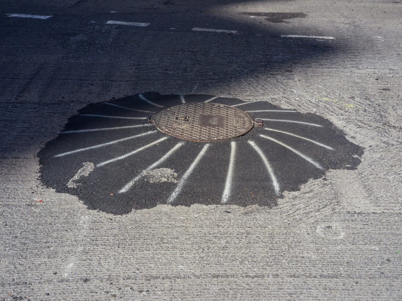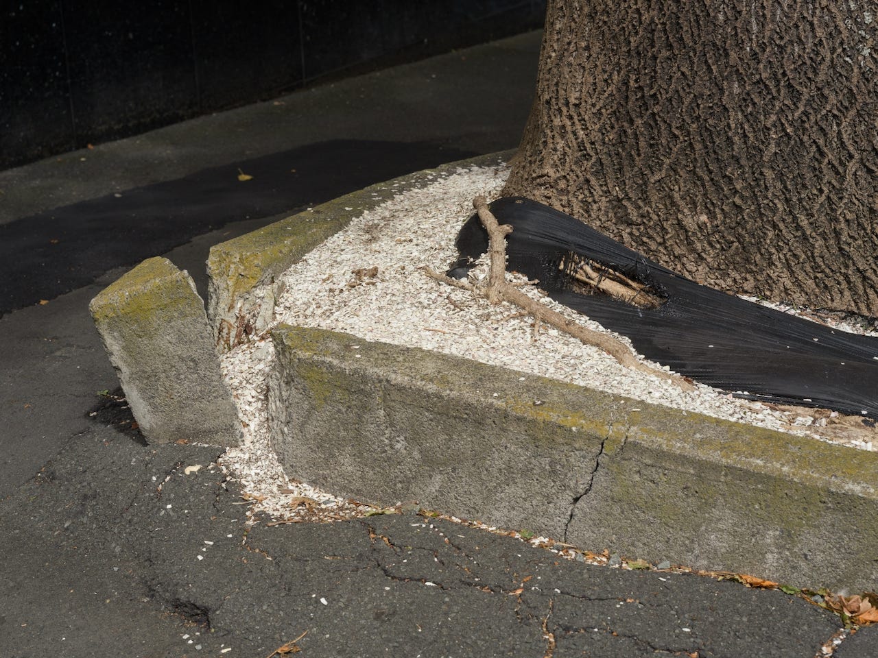 The tree did not read Heidegger. The tree broke the kerb because the tree was under the kerb and the kerb was in the way. The white stuff on the road is the inside of the kerb. The inside of things is usually white. Bread. Bone. Pages before you print on them.