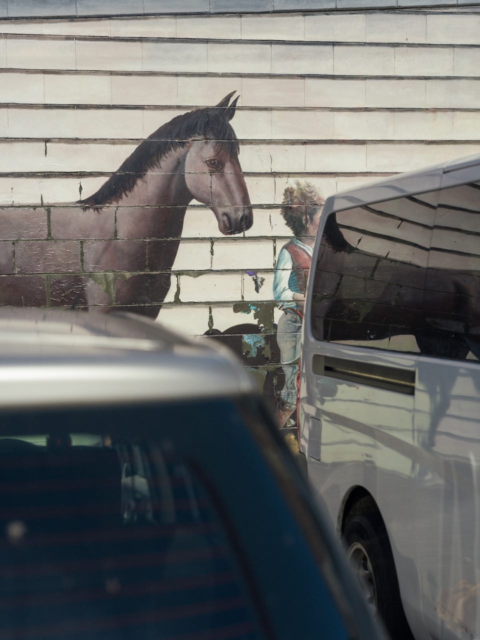 A woman three storeys high is losing her face to the rain. A panther is becoming a wall. A horse watches traffic through the gap between two parked cars and the horse has been watching traffic longer than most of the cars have existed. The paint will go and the horse will go and the wall will remain and the wall will be repainted and someone will photograph the new painting and someone will write about it. I was asked here and I will leave. But I was here and I looked at these photographs and something happened that I cannot account for.
